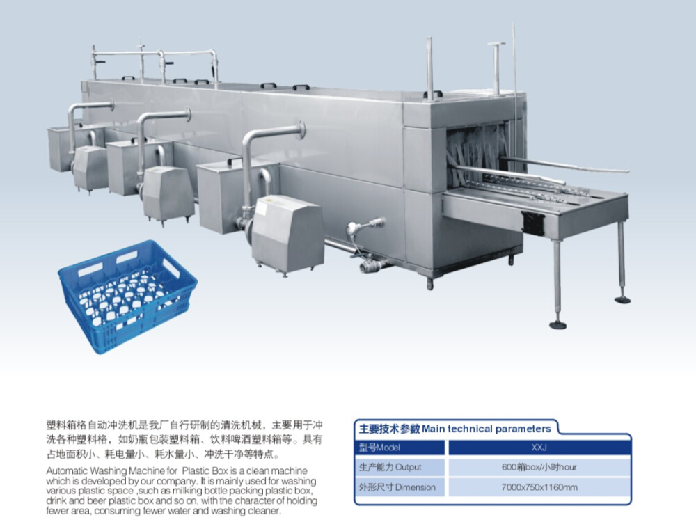 塑料箱格自動沖洗機是我廠自行研制的清洗機械,主要用于沖洗各種塑料格,如奶瓶包裝塑料箱、飲料啤酒塑料箱等。具有占地面積小、耗電量小、耗水量小、沖洗干凈等特點。